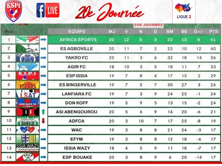Top 5 provisoire de la Poule A :Africa Sports d’Abidjan – 41 points (20 matchs)ES Agboville – 40 points (20 matchs)Yakro FC – 36 points (20 matchs)Agir FC – 33 points (18 matchs)ESPI – Un match en moins, 29 points (19 matchs joués)